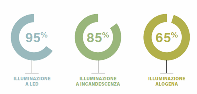 The energy savings achieved through the use of LED systems are approximately 95% compared to incandescent bulbs, 85% compared to halogen lamps, and 60% compared to fluorescent bulbs.
