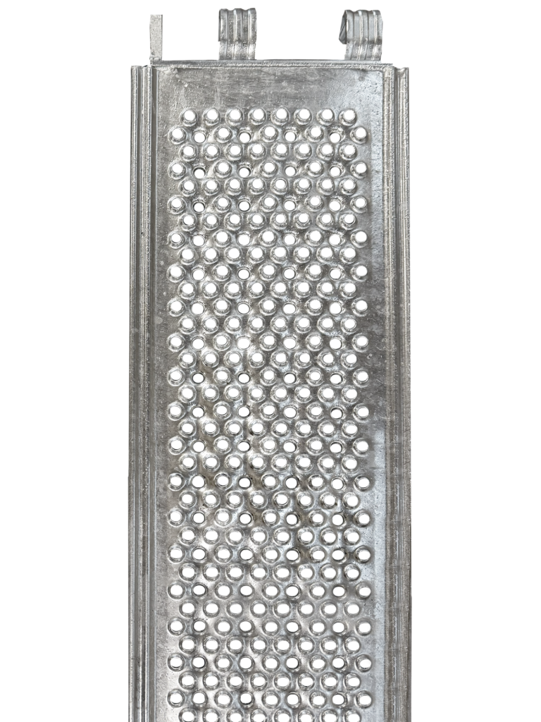 • Sheet metal deck of thickness 1.5 mm, with an open profile of height 76mm.The surface of the floor is provided with ø12mm holes in relief with non-slip effect.